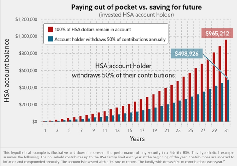 After funding your HSA, consider using non-HSA funds for immediate medical expenses. This strategy allows your HSA balance to remain invested for potential growth. To illustrate, let’s use an example: Assuming a 7% investment return, if you keep your HSA invested for 30+ years, you could potentially have approximately $450,000 more than someone who withdraws 50% of their HSA balance annually for current medical expenses.